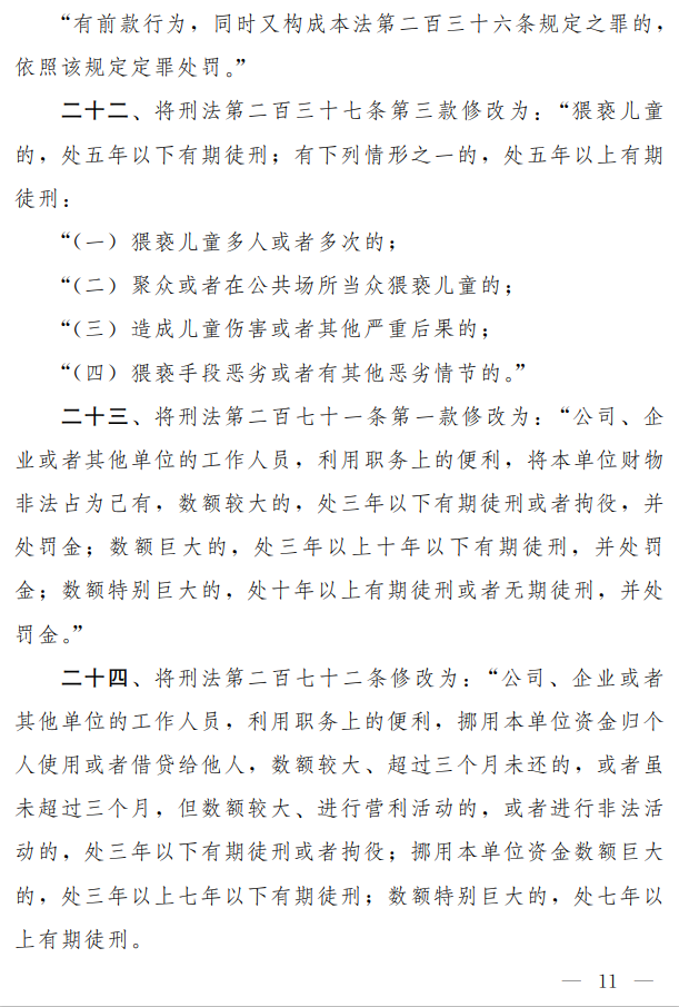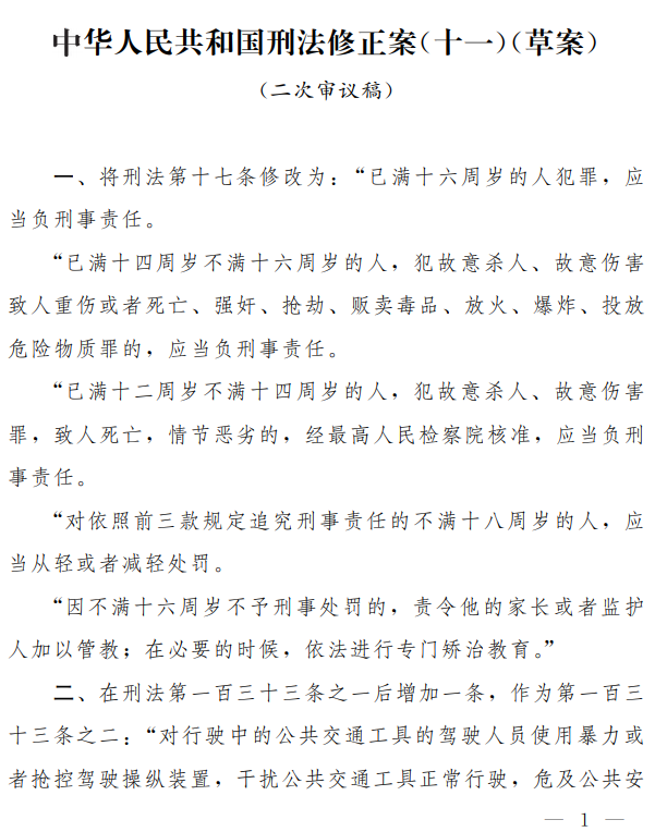 第十三屆全國人大常委會第二十二次會議對《中華人民共和國刑法修正案(十一)(草案二次審議稿)》進行了審議,現公布《中華人民共和國刑法修正案(十一)(草案二次審議稿)全文。