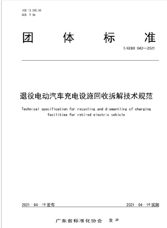 2021年4月19日,廣東省標(biāo)準(zhǔn)化協(xié)會發(fā)布團(tuán)體標(biāo)準(zhǔn)《退役電動汽車充電設(shè)施回收拆解技術(shù)規(guī)范》,為日漸增多的電動汽車充電設(shè)施的回收拆解提供技術(shù)支撐。