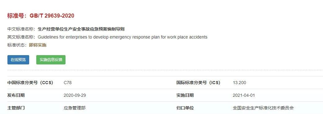 重磅!GBT29639-2020《生產(chǎn)經(jīng)營(yíng)單位生產(chǎn)安全事故應(yīng)急預(yù)案編制導(dǎo)則》發(fā)布,21年4月實(shí)施!