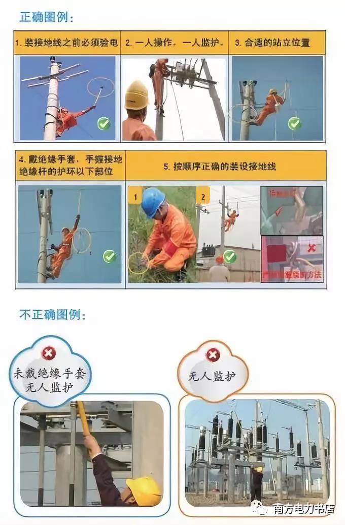 (2)裝設個人保安線應先裝接地端,后接導體端,拆接地線的順序與此相反。裝拆接地線均應使用絕緣棒或?qū)S媒^緣繩進行操作,并戴絕緣手套,裝、拆時人體不得觸碰接地線或未接地的導線,以防止感應電觸電。