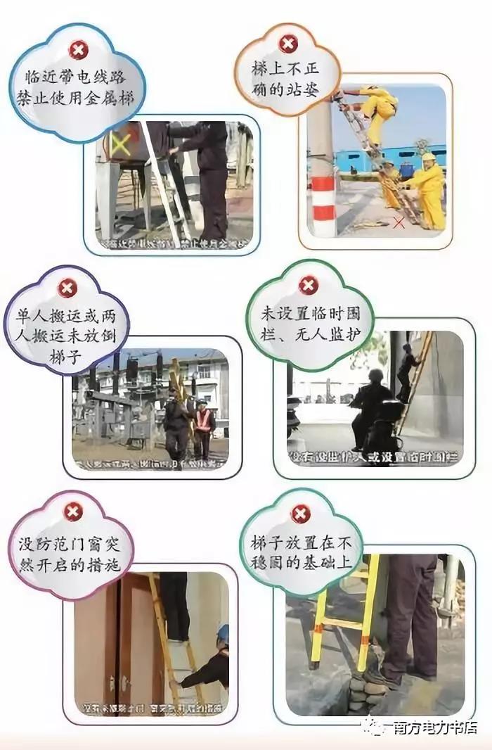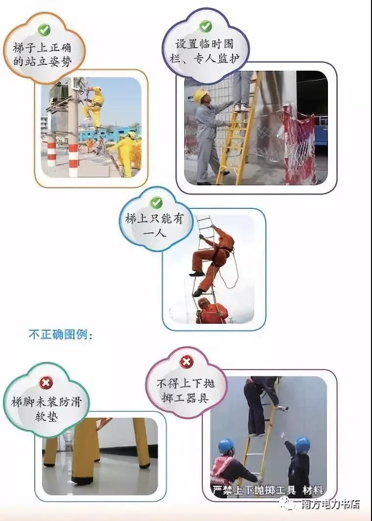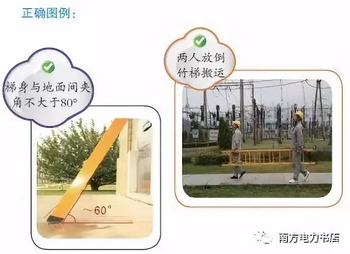 (6)在部分停電或不停電的作業(yè)環(huán)境下,應使用絕緣梯。在帶電設備區(qū)域中,距離運行設備較近時,嚴禁使用金屬梯。在戶外變電站和高壓室內(nèi)搬動梯子、管子等長物,應兩人放倒搬運,并與帶電部分保持足夠的安全距離,以免人身觸電氣設備發(fā)生事故。