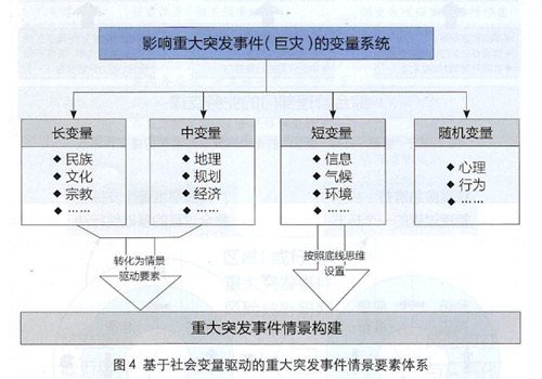 重大突發(fā)事件本身是一個(gè)復(fù)雜系統(tǒng)。當(dāng)嘗試通過“情景構(gòu)建”來表征重大突發(fā)事件的規(guī)律特點(diǎn)時(shí),按照社會(huì)物理學(xué)理論,需要對(duì)一系列社會(huì)變量進(jìn)行描述,決定重大突發(fā)事件情景的變量包含:長(zhǎng)變量(與民族、文化、宗教相關(guān)的變量)、中變量(與地理、規(guī)劃、經(jīng)濟(jì)、社會(huì)相關(guān)的變量)、短變量(與信息、氣候、環(huán)境、交通等相關(guān)的變量)、隨機(jī)變量(與心理、行為以及未知因素相關(guān)的變量)(見圖4)。為確保重大突發(fā)事件情景能夠準(zhǔn)確地代表不斷演化的國(guó)家風(fēng)險(xiǎn)(或者地區(qū)風(fēng)險(xiǎn)),情景構(gòu)建過程中,需將上面所述的長(zhǎng)變量與中變量設(shè)置為情景恒定要素,當(dāng)這兩類變量發(fā)生變動(dòng)時(shí),需要及時(shí)修訂情景;此外,關(guān)于短變量,應(yīng)該基于“底線思維”,設(shè)置可能導(dǎo)致事件往最壞方向發(fā)展的變量,這樣可以有效保證與情景所匹配的目標(biāo)能力具備“冗余”。而隨機(jī)變量,對(duì)于情景構(gòu)建來說不具備較大價(jià)值,不應(yīng)該在情景中描述。
