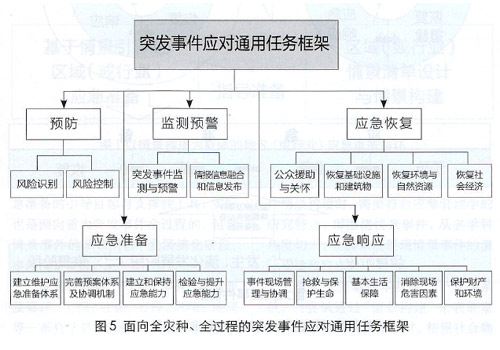 筆者所在課題組參考美國(guó)UTL的格式,對(duì)我國(guó)多災(zāi)種的應(yīng)對(duì)任務(wù)進(jìn)行了分析,提出了符合我國(guó)體制機(jī)制特點(diǎn)的突發(fā)事件應(yīng)對(duì)通用任務(wù)框架,該框架包含5類任務(wù)領(lǐng)域、17類一級(jí)任務(wù)、64類二級(jí)任務(wù)(如圖5所示)。該任務(wù)框架是面向全災(zāi)種、全過程的任務(wù)框架,無論哪種類型的突發(fā)事件情景,均可在該框架的引導(dǎo)下開展任務(wù)梳理。