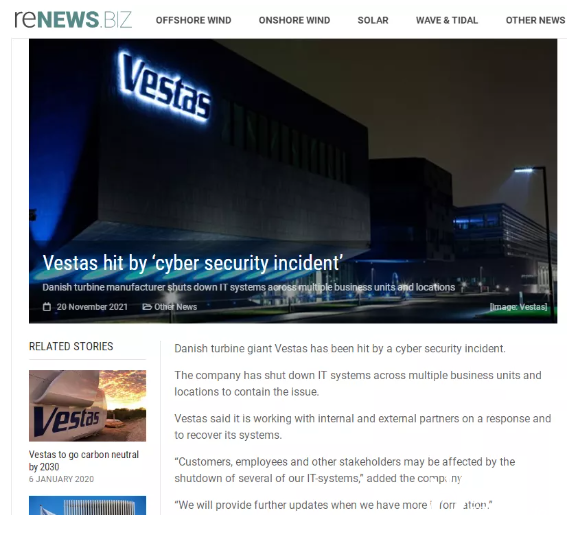 據(jù)外媒報道,11月20日維斯塔斯遭遇網(wǎng)絡(luò)安全事故,目前已經(jīng)關(guān)閉多個業(yè)務(wù)部門和地點(diǎn)的信息技術(shù)系統(tǒng),以控制這一問題。