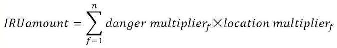 定義綜合指標(biāo)火災(zāi)風(fēng)險單元(ignition risk unit,IRU)。每次火災(zāi)的具體考核中,加入“地理分布因子Location multiplier”和“火災(zāi)危險等級因子danger multiplier”,計算公式為:
