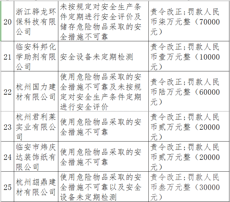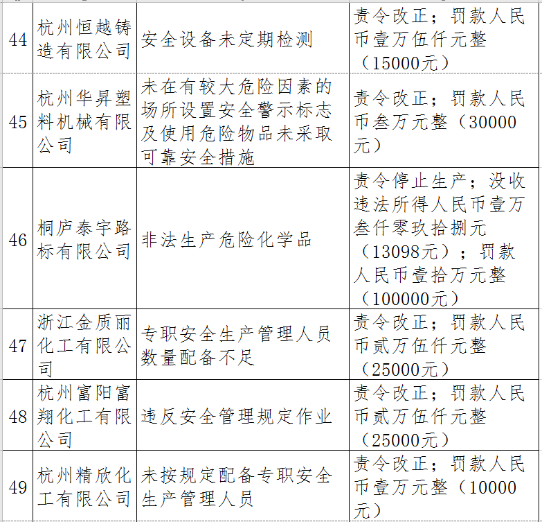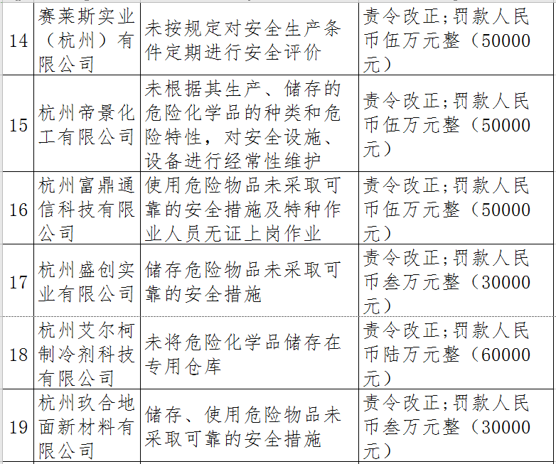 據(jù)了解,今年上半年,杭州市應(yīng)急管理局一手抓駐企復(fù)工復(fù)產(chǎn)、一手抓安全生產(chǎn),已完成年度執(zhí)法計(jì)劃、專項(xiàng)檢查、聯(lián)合執(zhí)法、信訪舉報(bào)核查等,并對檢查中發(fā)現(xiàn)的安全生產(chǎn)違法違規(guī)企業(yè)(個(gè)人)進(jìn)行了處罰?,F(xiàn)對52家被行政處罰的企業(yè)(個(gè)人)進(jìn)行曝光,希望各企業(yè)引以為戒!