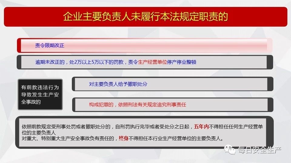 組織機(jī)構(gòu)和職責(zé) | 主要負(fù)責(zé)人未履行安全生產(chǎn)管理職責(zé)的 | 責(zé)令限期改正 | 對(duì)主要負(fù)責(zé)人處二萬(wàn)元以上五萬(wàn)元以下的罰款,責(zé)令生產(chǎn)經(jīng)營(yíng)單位停產(chǎn)停業(yè)整頓。 |