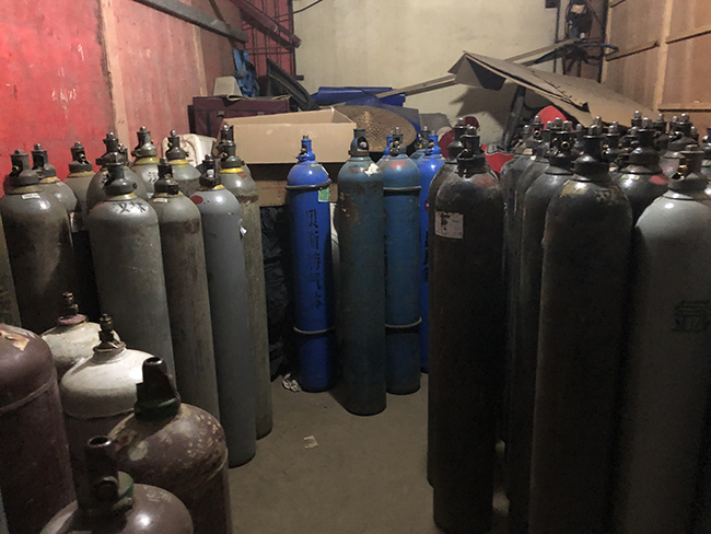 浙江杭州市案例:2021年3月8日上午,浙江省杭州市蕭山區(qū)應急管理局執(zhí)法人員對某公司進行執(zhí)法檢查。期間,執(zhí)法人員發(fā)現(xiàn)廠區(qū)內(nèi)一簡易鋼棚搭設的倉庫,玻璃窗均被物體人為遮擋,檢查發(fā)現(xiàn)倉庫內(nèi)堆放了大量危化品,包括滿瓶二氧化碳、氧氣、乙炔、混合氣體、氮氣等176個氣瓶。同時,該倉庫緊鄰公司員工宿舍樓搭設,宿舍樓里還住著數(shù)十個工人,一旦發(fā)生爆炸,后果不堪設想。