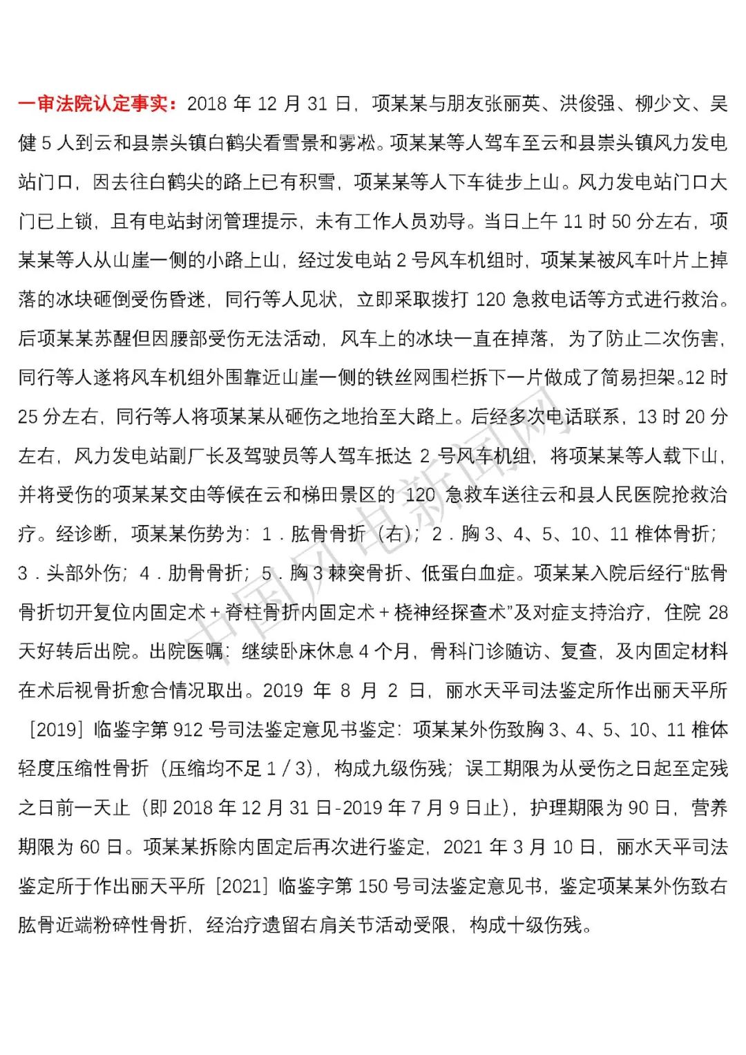 法院認(rèn)定事實(shí):2018年12月31日,項(xiàng)建英與朋友張麗英、洪俊強(qiáng)、柳少文、吳健5人到云和縣崇頭鎮(zhèn)白鶴尖看雪景和霧凇。項(xiàng)建英等人駕車至云和縣崇頭鎮(zhèn)風(fēng)力發(fā)電站門口,因去往白鶴尖的路上已有積雪,項(xiàng)建英等人下車徒步上山。風(fēng)力發(fā)電站門口大門已上鎖,且有電站封閉管理提示,未有工作人員勸導(dǎo)。當(dāng)日上午11時(shí)50分左右,項(xiàng)建英等人從山崖一側(cè)的小路上山,經(jīng)過發(fā)電站2號(hào)風(fēng)車機(jī)組時(shí),項(xiàng)建英被風(fēng)車葉片上掉落的冰塊砸倒受傷昏迷,同行等人見狀,立即采取撥打120急救電話等方式進(jìn)行救治。后項(xiàng)建英蘇醒但因腰部受傷無法活動(dòng),風(fēng)車上的冰塊一直在掉落,為了防止二次傷害,同行等人遂將風(fēng)車機(jī)組外圍靠近山崖一側(cè)的鐵絲網(wǎng)圍欄拆下一片做成了簡(jiǎn)易擔(dān)架。12時(shí)25分左右,同行等人將項(xiàng)建英從砸傷之地抬至大路上。后經(jīng)多次電話聯(lián)系,13時(shí)20分左右,風(fēng)力發(fā)電站副廠長(zhǎng)及駕駛員等人駕車抵達(dá)2號(hào)風(fēng)車機(jī)組,將項(xiàng)建英等人載下山,并將受傷的項(xiàng)建英交由等候在云和梯田景區(qū)的120急救車送往云和縣人民醫(yī)院搶救治療。經(jīng)診斷,項(xiàng)建英傷勢(shì)為:1.肱骨骨折(右);2.胸3、4、5、10、11椎體骨折;3.頭部外傷;4.肋骨骨折;5.胸3棘突骨折、低蛋白血癥。項(xiàng)建英入院后經(jīng)行“肱骨骨折切開復(fù)位內(nèi)固定術(shù)+脊柱骨折內(nèi)固定術(shù)+橈神經(jīng)探查術(shù)”及對(duì)癥支持治療,住院28天好轉(zhuǎn)后出院。出院醫(yī)囑:繼續(xù)臥床休息4個(gè)月,骨科門診隨訪、復(fù)查,及內(nèi)固定材料在術(shù)后視骨折愈合情況取出。2019年8月2日,麗水天平司法鑒定所作出麗天平所[2019]臨鑒字第912號(hào)司法鑒定意見書鑒定:項(xiàng)建英外傷致胸3、4、5、10、11椎體輕度壓縮性骨折(壓縮均不足1/3),構(gòu)成九級(jí)傷殘;誤工期限為從受傷之日起至定殘之日前一天止(即2018年12月31日-2019年7月9日止),護(hù)理期限為90日,營(yíng)養(yǎng)期限為60日。項(xiàng)建英拆除內(nèi)固定后再次進(jìn)行鑒定,2021年3月10日,麗水天平司法鑒定所于作出麗天平所[2021]臨鑒字第150號(hào)司法鑒定意見書,鑒定項(xiàng)建英外傷致右肱骨近端粉碎性骨折,經(jīng)治療遺留右肩關(guān)節(jié)活動(dòng)受限,構(gòu)成十級(jí)傷殘。