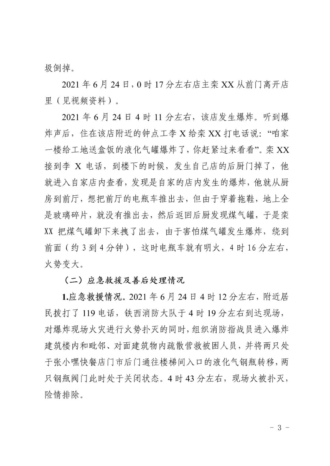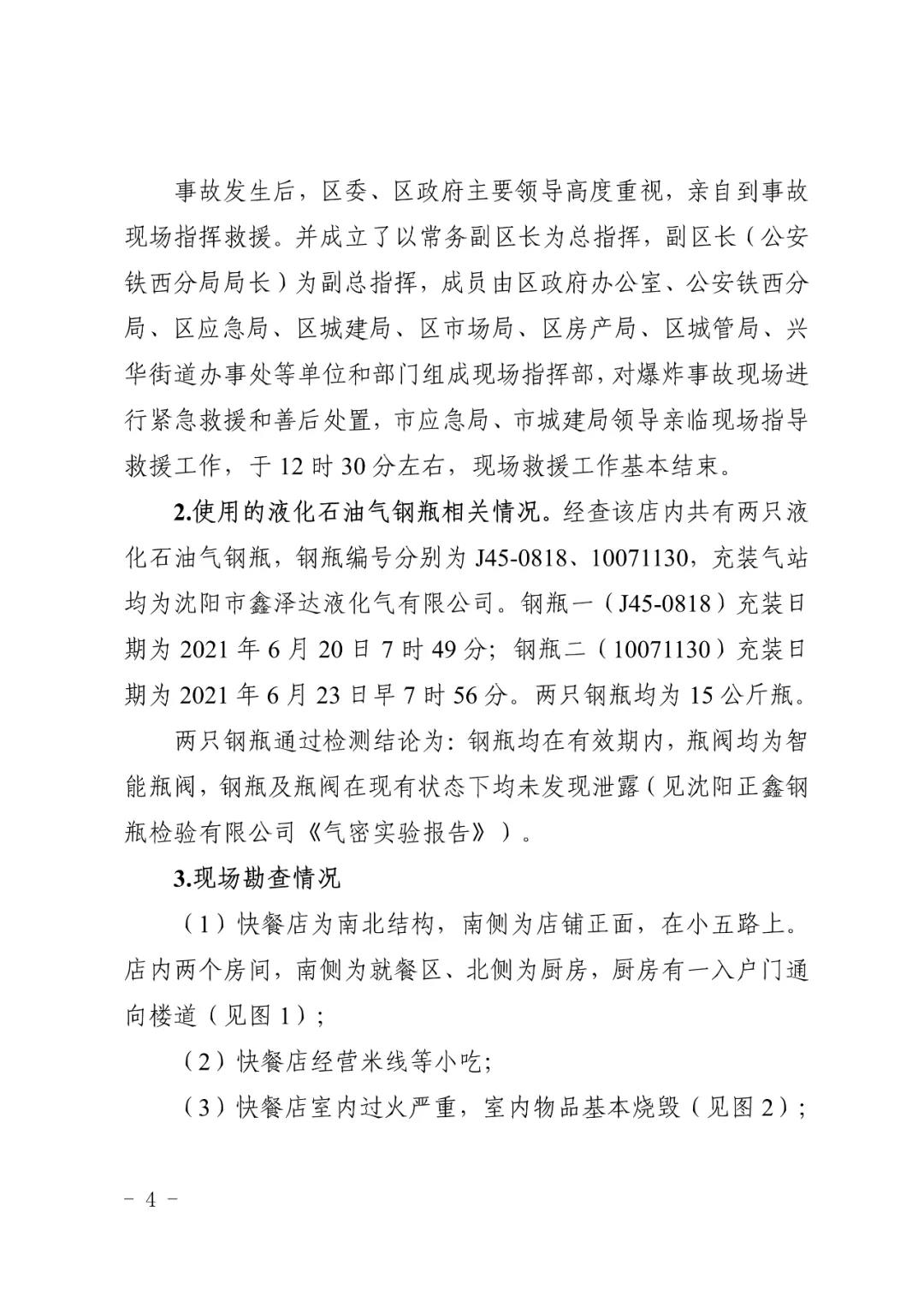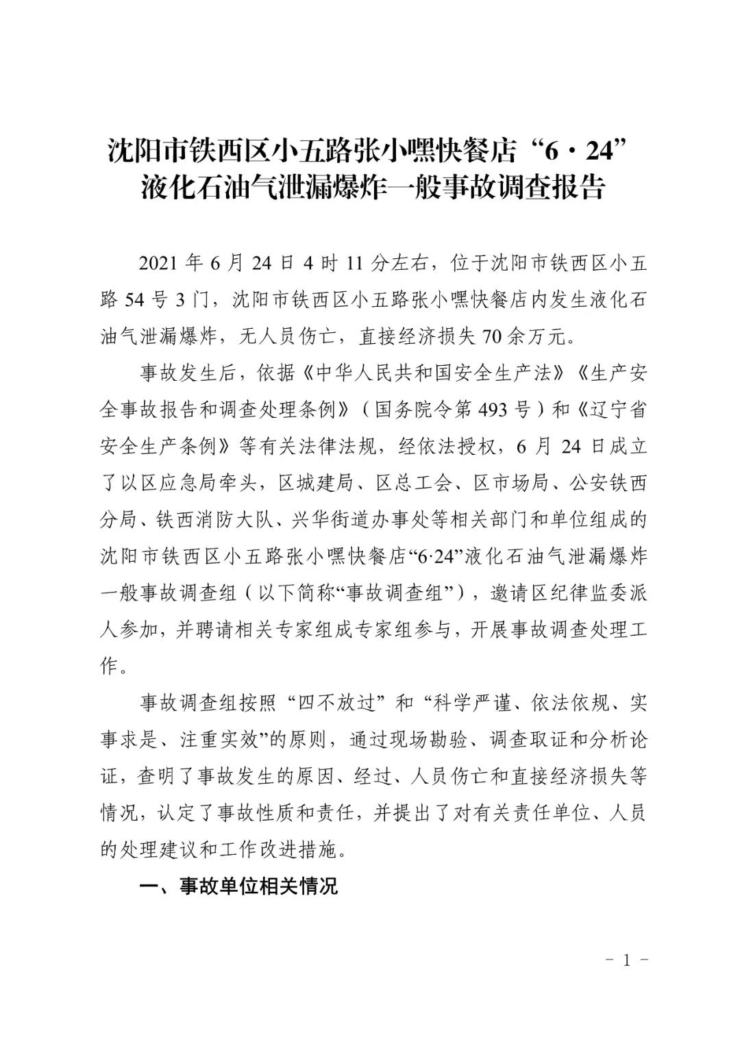 2021 年 6 月 24 日 4 時(shí) 11 分左右,位于沈陽(yáng)市鐵西區(qū)小五路 54 號(hào) 3 門,沈陽(yáng)市鐵西區(qū)小五路張小嘿快餐店內(nèi)發(fā)生液化石油氣泄漏爆炸,無人員傷亡,直接經(jīng)濟(jì)損失 70 余萬元。
