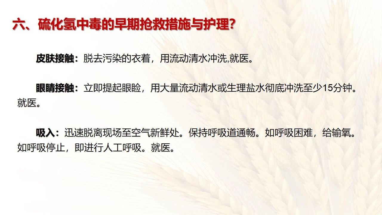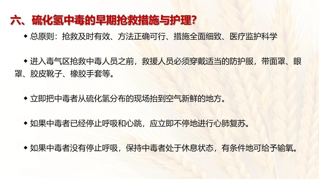 涉及硫化氫的裝置、設(shè)備設(shè)施應(yīng)制定硫化氫中毒專項(xiàng)應(yīng)急預(yù)案、現(xiàn)場(chǎng)處置方案,發(fā)生硫化氫中毒事故時(shí),參與現(xiàn)場(chǎng)搶救者必須在做好安全防護(hù)保障情況下進(jìn)行施救。應(yīng)穿隔離衣、戴防毒用具(空呼等),切忌盲目施救,謹(jǐn)防自身中毒。應(yīng)快速將患者抬離中毒現(xiàn)場(chǎng),移至空氣新鮮通風(fēng)良好處,解開(kāi)衣服、褲帶等,吸入氧氣,及早使用糖皮質(zhì)激素,適當(dāng)使用解毒藥物,同時(shí)積極對(duì)癥處理?yè)尵日?。?duì)呼吸停止者,應(yīng)及時(shí)進(jìn)行人工呼吸,有條件者應(yīng)及時(shí)行氣管插管、機(jī)械通氣。