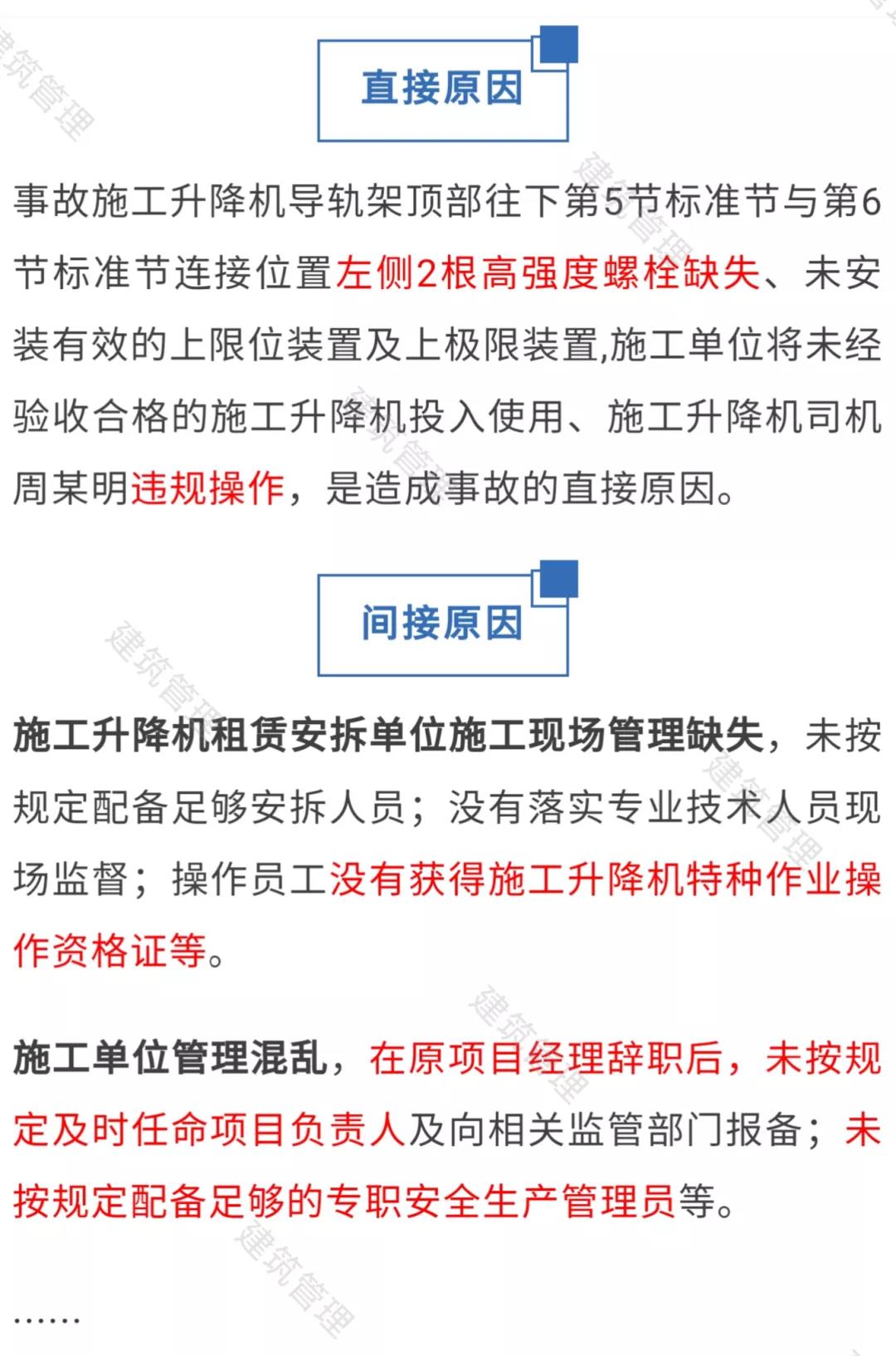 事故施工升降機導(dǎo)軌架頂部往下第5節(jié)標準節(jié)與第6節(jié)標準節(jié)連接位置左側(cè)2根高強度螺栓缺失、未安裝有效的上限位裝置及上極限裝置,廣東龍越建筑工程有限公司將未經(jīng)驗收合格的施工升降機投入使用、施工升降機司機周建明違規(guī)操作,是造成事故的直接原因。