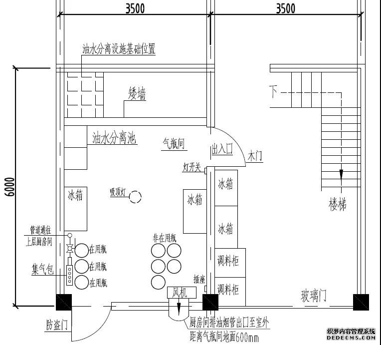 東面2層為磚混結(jié)構(gòu),一樓東面為氣瓶間,西面為樓梯間和食料間;氣瓶間四周均為實(shí)體墻,在西北角有一木門(mén)開(kāi)向樓梯食料間,氣瓶間東南角設(shè)有鐵質(zhì)防盜門(mén),可開(kāi)向室外;二樓東面為廚房間,西面為過(guò)道和收銀臺(tái)。