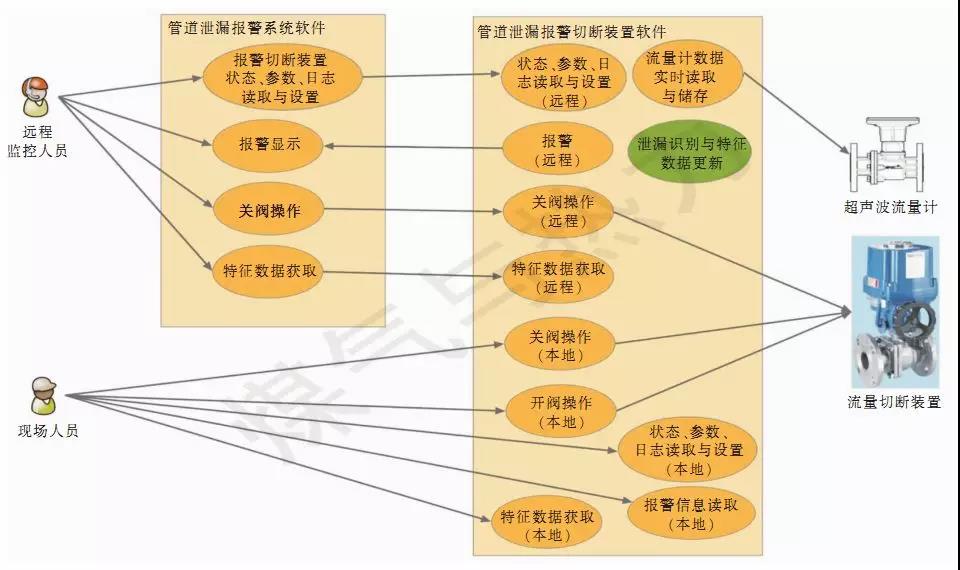本系統(tǒng)選擇日本愛(ài)知AS超聲波流量計(jì),為速度式流量計(jì)。其使用壓力小于等于1.0 MPa,防爆防護(hù)等級(jí)為EX ib IIB T4 Gb IP65,數(shù)據(jù)通信協(xié)議為RS485 MODBUS/RTU,精度等級(jí)為1.0級(jí)。超聲波流量計(jì)相較于其他類型流量計(jì)(如渦輪流量計(jì)),由于無(wú)轉(zhuǎn)動(dòng)組件,不受慣性影響,對(duì)瞬時(shí)流量變化的靈敏度更高,且流量范圍較廣,始動(dòng)流量較小,例如DN 50 mm口徑的超聲波流量計(jì)始動(dòng)流量為0.37 m3/h,DN 100 mm口徑的超聲波流量計(jì)始動(dòng)流量為1.25 m3/h。對(duì)小流量感知更靈敏,用于管網(wǎng)瞬時(shí)流量的監(jiān)測(cè)與捕捉,比較適合[5]。本系統(tǒng)選擇的遠(yuǎn)傳裝置為山東思達(dá)特ST2000模塊,其負(fù)責(zé)太陽(yáng)能電池系統(tǒng)供電管理和與燃?xì)夤镜谋O(jiān)測(cè)平臺(tái)系統(tǒng)遠(yuǎn)程通信。遠(yuǎn)傳裝置采用RS485直讀方式從數(shù)據(jù)采集分析裝置獲取數(shù)據(jù),通過(guò)GPRS/CDMA無(wú)線通信進(jìn)行遠(yuǎn)傳,發(fā)送流量數(shù)據(jù)與報(bào)警信息,接收監(jiān)測(cè)平臺(tái)系統(tǒng)的指令,并下達(dá)到數(shù)據(jù)采集分析裝置。數(shù)據(jù)采集分析裝置與流量計(jì)、遠(yuǎn)傳裝置、太陽(yáng)能電池系統(tǒng)等連接。超聲波流量計(jì)自帶電池可單獨(dú)運(yùn)行。整套供電系統(tǒng)可以正常運(yùn)行6 a以上。 為實(shí)現(xiàn)流量監(jiān)測(cè)、泄漏識(shí)別、報(bào)警遠(yuǎn)傳、遠(yuǎn)程切斷等功能,系統(tǒng)軟件主要由本地管道泄漏報(bào)警切斷裝置軟件和遠(yuǎn)端管道泄漏報(bào)警系統(tǒng)軟件兩部分組成。系統(tǒng)用例圖(軟件開(kāi)發(fā)用于系統(tǒng)業(yè)務(wù)功能需求分析、系統(tǒng)建模的示意圖)見(jiàn)圖3,參與者包括:管道泄漏報(bào)警切斷裝置軟件、超聲波流量計(jì)、流量切斷裝置、管道泄漏報(bào)警系統(tǒng)軟件、遠(yuǎn)程監(jiān)控人員、現(xiàn)場(chǎng)人員。其中,管道泄漏報(bào)警系統(tǒng)可以是其他的SCADA平臺(tái)系統(tǒng),這里只是為完成遠(yuǎn)程泄漏監(jiān)測(cè)、報(bào)警、遠(yuǎn)程切斷、參數(shù)設(shè)置等功能,所列舉的功能模塊。本文主要探討本地管道泄漏報(bào)警切斷裝置軟件的設(shè)計(jì),即數(shù)據(jù)采集分析裝置主板的內(nèi)置程序,配合遠(yuǎn)傳裝置實(shí)現(xiàn)相關(guān)功能。由圖3可知,管道泄漏報(bào)警切斷裝置軟件設(shè)計(jì)包括泄漏識(shí)別與特征數(shù)據(jù)更新,流量計(jì)數(shù)據(jù)實(shí)時(shí)讀取與儲(chǔ)存,狀態(tài)、參數(shù)、日志讀取與設(shè)置(遠(yuǎn)程發(fā)送與本地操作),報(bào)警(遠(yuǎn)程發(fā)送),關(guān)閥操作(遠(yuǎn)程操作),特征數(shù)據(jù)獲取(遠(yuǎn)程發(fā)送與本地操作),報(bào)警信息讀?。ū镜夭僮鳎?,開(kāi)關(guān)閥操作(本地操作)等程序功能組成。遠(yuǎn)程監(jiān)控人員通過(guò)SCADA系統(tǒng)進(jìn)行遠(yuǎn)程交互操作。現(xiàn)場(chǎng)人員通過(guò)數(shù)據(jù)采集分析裝置按鍵、顯示屏、SD卡進(jìn)行本地交互操作[6]。