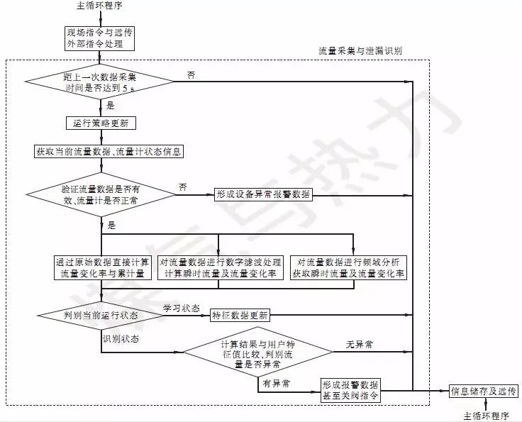 為實(shí)現(xiàn)上述功能,本地管道泄漏報(bào)警切斷裝置軟件程序邏輯架構(gòu)由基礎(chǔ)層、技術(shù)服務(wù)層、應(yīng)用層3層組成?;A(chǔ)層包含各硬件操作的底層驅(qū)動(dòng)程序,如數(shù)據(jù)采集分析裝置與流量計(jì)、遠(yuǎn)傳裝置的RS485串口通信,SD卡數(shù)據(jù)的讀取與儲(chǔ)存,按鍵操作讀取等模塊。技術(shù)服務(wù)層為實(shí)現(xiàn)系統(tǒng)功能邏輯,提供相關(guān)的工具組件,調(diào)用基礎(chǔ)層的驅(qū)動(dòng)程序接口,對(duì)數(shù)據(jù)進(jìn)行解釋、加工處理,并向應(yīng)用層提供數(shù)據(jù)服務(wù)接口,方便功能邏輯的調(diào)用,包括開(kāi)關(guān)閥指令處理、流量計(jì)數(shù)據(jù)采集與儲(chǔ)存、報(bào)警信息發(fā)送、報(bào)警數(shù)據(jù)儲(chǔ)存與讀取、參數(shù)信息儲(chǔ)存與讀取、數(shù)據(jù)的本地顯示、數(shù)據(jù)頻譜分析工具、時(shí)鐘校對(duì)等模塊。應(yīng)用層實(shí)現(xiàn)系統(tǒng)的邏輯功能,通過(guò)主循環(huán)程序周期循環(huán)調(diào)用流量采集與泄漏識(shí)別模塊、現(xiàn)場(chǎng)按鍵指令處理模塊、遠(yuǎn)傳外部指令處理模塊,實(shí)現(xiàn)系統(tǒng)的自動(dòng)運(yùn)行與對(duì)外交互。主循環(huán)程序運(yùn)行流量采集與泄漏識(shí)別模塊的程序流程見(jiàn)圖4。該部分為系統(tǒng)的核心功能之一,通過(guò)定時(shí)中斷程序?qū)崿F(xiàn)循環(huán)運(yùn)行。進(jìn)入主程序模塊后,首先判斷流量采集周期是否滿足,即當(dāng)前時(shí)間距上一次流量采集時(shí)間是否滿足采集間隔(5 s),如果否,則跳出本次流量采集與泄漏識(shí)別操作;如果是,則執(zhí)行泄漏識(shí)別運(yùn)行策略更新程序,檢查識(shí)別參數(shù)、指令是否有修改,并進(jìn)行數(shù)據(jù)更新。從流量計(jì)獲取實(shí)時(shí)流量原始數(shù)據(jù)與狀態(tài)信息,檢查數(shù)據(jù)的有效性,例如報(bào)文中是否有報(bào)警或錯(cuò)誤數(shù)據(jù),檢查流量計(jì)狀態(tài)是否正常。如果數(shù)據(jù)無(wú)效或流量計(jì)狀態(tài)不正常,則形成設(shè)備異常報(bào)警數(shù)據(jù),執(zhí)行信息儲(chǔ)存、遠(yuǎn)傳。如果數(shù)據(jù)有效,則對(duì)數(shù)據(jù)進(jìn)行計(jì)算處理及識(shí)別分析。計(jì)算處理過(guò)程包括3種方式,3種方式均通過(guò)原始流量數(shù)據(jù)計(jì)算某時(shí)段的流量累計(jì)值。對(duì)于原始流量變化比較平穩(wěn)即系統(tǒng)不存在調(diào)壓器喘振導(dǎo)致的流量頻繁波動(dòng)時(shí),可通過(guò)原始流量數(shù)據(jù)直接計(jì)算獲取流量變化率,速度較快,實(shí)時(shí)性較強(qiáng)。如果調(diào)壓器喘振導(dǎo)致流量波動(dòng)干擾較大,則需要將喘振干擾部分濾掉后再進(jìn)行下一步計(jì)算分析,可以對(duì)流量數(shù)據(jù)進(jìn)行數(shù)字濾波處理或頻域分析處理,然后計(jì)算瞬時(shí)流量及流量變化率。數(shù)字濾波處理和頻域分析處理這兩種方法,去除干擾的原理不同,可以選擇其中一種方法,或兩者都使用,達(dá)到雙重保險(xiǎn)的目的。這兩種方法實(shí)時(shí)性稍弱,但可有效降低喘振干擾造成的誤報(bào)。接下來(lái)判別當(dāng)前運(yùn)行狀態(tài),當(dāng)數(shù)據(jù)采集分析裝置用于管網(wǎng)用氣規(guī)律搜集即學(xué)習(xí)階段時(shí),程序不進(jìn)行泄漏識(shí)別操作,而是直接生成并儲(chǔ)存用戶特征數(shù)據(jù)。當(dāng)數(shù)據(jù)采集分析裝置用于管網(wǎng)泄漏監(jiān)測(cè)識(shí)別時(shí),程序?qū)?dāng)前計(jì)算結(jié)果與用戶特征值進(jìn)行比較,判別流量是否異常,當(dāng)有異常時(shí),形成報(bào)警數(shù)據(jù)甚至關(guān)閥指令,之后執(zhí)行信息儲(chǔ)存、遠(yuǎn)傳等后續(xù)主程序指令,完成一次循環(huán)。