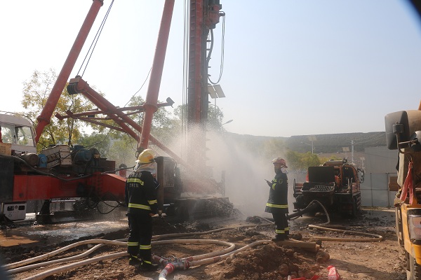蘭州支隊七里河消防大隊第一時間到達現(xiàn)場參與處置,到達現(xiàn)場后發(fā)現(xiàn):現(xiàn)場管道仍處于天然氣泄漏狀態(tài),未有明火發(fā)生?,F(xiàn)場指戰(zhàn)員立即設置警戒線,對現(xiàn)場圍觀施工人員及群眾進行疏散撤離,對泄露事故點毗鄰居民樓進行人員通告疏散,同時設置水槍防護陣地。隨著增援中隊處置力量的到達,現(xiàn)場處置指揮員七里河大隊大隊長,統(tǒng)一指揮調(diào)度現(xiàn)場事故處置力量:首先,結(jié)合現(xiàn)場街道路況,設置疏散組,對毗鄰居民樓全面進行人員清查疏散。設置警戒組并專人看守,嚴防非事故處置人員進入。然后在先期到達成立的消防水槍防護陣地基礎上,增設水槍防護陣地;其次調(diào)派到達現(xiàn)場的增援消防中隊兩臺水罐消防車全程待命,做好供水保障。