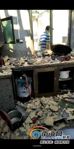 記者在當?shù)鼐用裉峁┑囊欢我曨l中看到,發(fā)生爆炸的廚房為一間瓦房,屋內有灶臺和一張圓桌,煤氣罐放在灶臺下方。煤氣罐上方的屋頂被沖擊波轟開,玻璃窗全被震碎,屋內散落著碎瓦片和玻璃渣,原本放在桌上的餐具散落一地。廚房門口上方墻體出現(xiàn)半米長的裂縫,震裂脫落的木門被炸飛出房門外約1米的地上,屋外的水桶等雜物也被震倒。