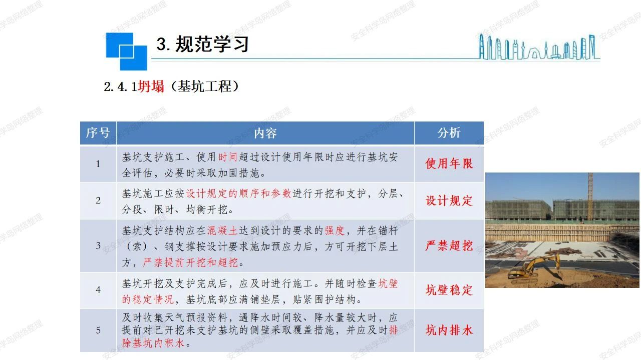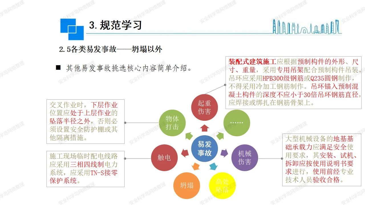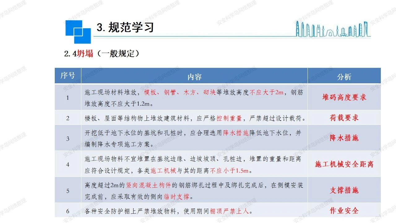 那么,坍塌事故發(fā)生的原因何在? (1)工程結(jié)構(gòu)設(shè)計不合理或計算失誤。 (2)施工前沒有編制切實可行的施工組織設(shè)計和專項施工方案,未做具體技術(shù)安全措施交底,特定施工項目未經(jīng)專家評審論證。 (3)腳手架、模板支撐、起重設(shè)備結(jié)構(gòu)設(shè)計不合理或計算失誤。 (4)建筑物結(jié)構(gòu)質(zhì)量低劣,安全性能差,地基不穩(wěn)定,不均勻沉降。 (5)建筑物結(jié)構(gòu)支撐連接(焊接)不牢固,超載、外力沖擊或嚴重偏心載荷造成失穩(wěn)等。 (6)腳手架及高大模板支架架體結(jié)構(gòu)不符合設(shè)計與規(guī)范要求,整體安全穩(wěn)定性差、超載或嚴重偏心荷載,遇外力沖擊或振動,不按程序拆除架體等因素造成失穩(wěn)等。 (7)基坑、土石方挖土?xí)r土壁不按規(guī)定留設(shè)邊坡(甚至負坡度),缺乏支護或支護不良,土質(zhì)不良或出現(xiàn)地下水、地表水的滲透,土壁經(jīng)不起重載側(cè)壓力或遇外力振動、沖擊等因素造成土壁失穩(wěn)滑坡坍塌。 (8)起重設(shè)備技術(shù)安全性能差,結(jié)構(gòu)強度不夠,安全防護裝置不完善,垂直起重機與建筑物拉結(jié)差,出現(xiàn)超載、碰撞、升降過度或違章操作等原因,造成起重設(shè)備倒塌。 (9)現(xiàn)場作業(yè)環(huán)境不良,安全防護設(shè)施缺乏。 (10)施工現(xiàn)場管理松弛,各項質(zhì)量、安全管理制度流于形式。 (11)片面追求經(jīng)濟利益,偷工減料,施工質(zhì)量差。 (12)施工隊伍素質(zhì)差,不執(zhí)行法規(guī)、標(biāo)準(zhǔn),違章指揮、違章作業(yè),思想上存在盲目性、冒險性、隨意性。 如何預(yù)防坍塌事故? (1)根據(jù)設(shè)計與規(guī)范要求,認真編制施工組織設(shè)計和專項施工技術(shù)方案、應(yīng)急預(yù)案,做好特定施工項目專家評審論證及技術(shù)安全交底工作。 (2)支架、腳手架等搭設(shè)完成后應(yīng)組織相關(guān)部門驗收。支架還應(yīng)按方案要求進行堆載預(yù)壓。 (3)嚴格控制模板支架、腳手架等承受的荷載,模板、腳手架及其支撐體系的施工荷載應(yīng)做到均勻分布,并不得超過設(shè)計要求。嚴禁超載、對構(gòu)筑物進行外力沖擊或偏心載荷。 (4)基坑、土石方挖土?xí)r土壁按規(guī)定留設(shè)邊坡,嚴格按照設(shè)計坡度進行放坡開挖,進行有效支護和排水,并設(shè)置專人對邊坡穩(wěn)定性進行檢測。基坑應(yīng)基坑頂邊緣1m范圍內(nèi)禁止堆放材料。 (5)加強起重設(shè)備的采購管理,嚴禁使用不合格的起重設(shè)備,并定期進行檢測,確保各項性能和安全防護裝置良好;加強起重設(shè)備的安裝、拆除管理;加強起重設(shè)備的使用管理,嚴禁超載、碰撞或違章操作;加強對起重設(shè)備操作人員、指揮人員、安拆人員的安全教育培訓(xùn),考核合格后持證上崗。 (6)加強施工現(xiàn)場管理,設(shè)置有效安全防護設(shè)施。 (7)加強對從業(yè)人員的培訓(xùn)教育,提高隊伍素質(zhì),強化質(zhì)量、安全意識。 (8)強化工程質(zhì)量報驗和檢驗、簽證制度,不經(jīng)檢驗合格,不準(zhǔn)進行下道工序施工。 (9)發(fā)現(xiàn)坍塌事故的險情,要認真分析原因,積極研究提出排除隱患的整改措施,并監(jiān)督執(zhí)行。