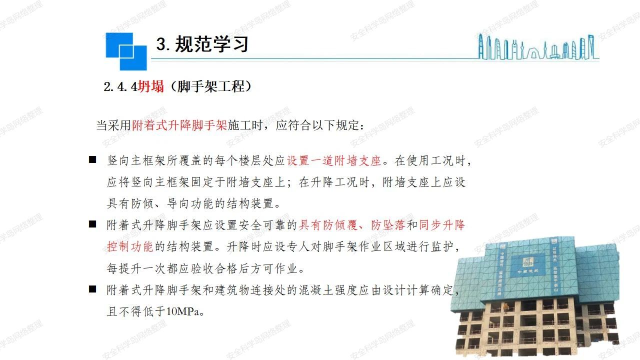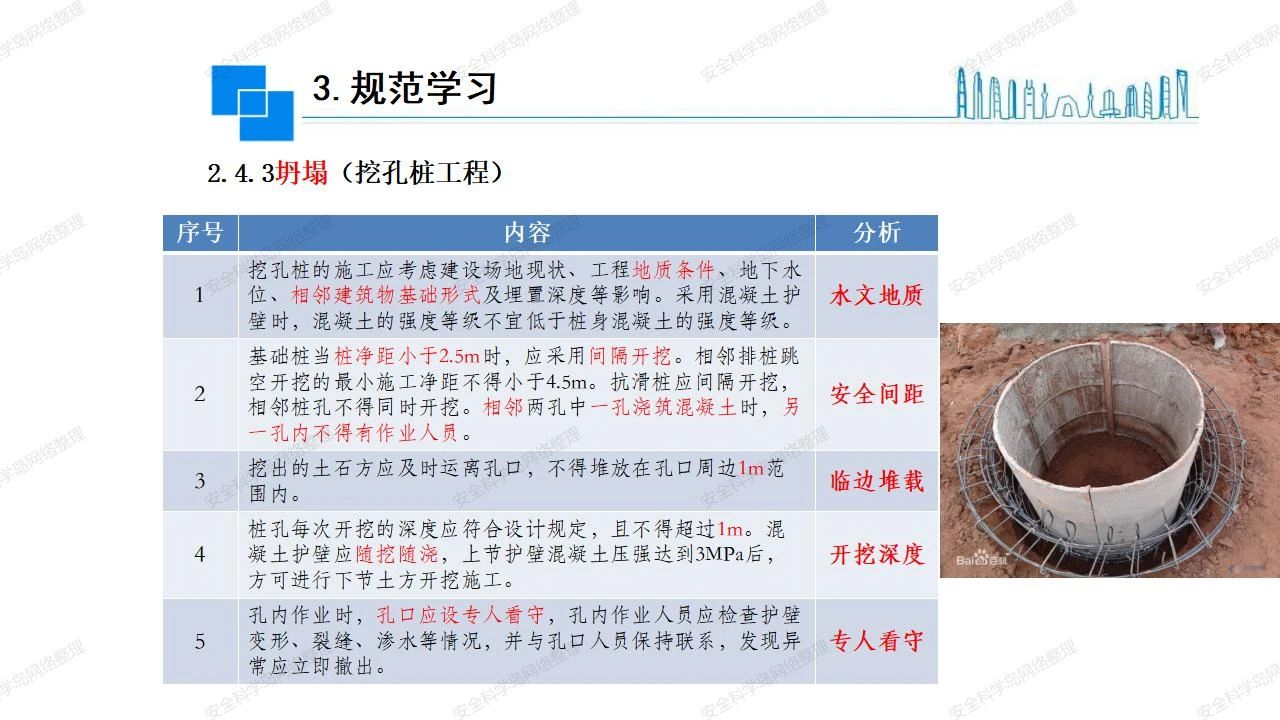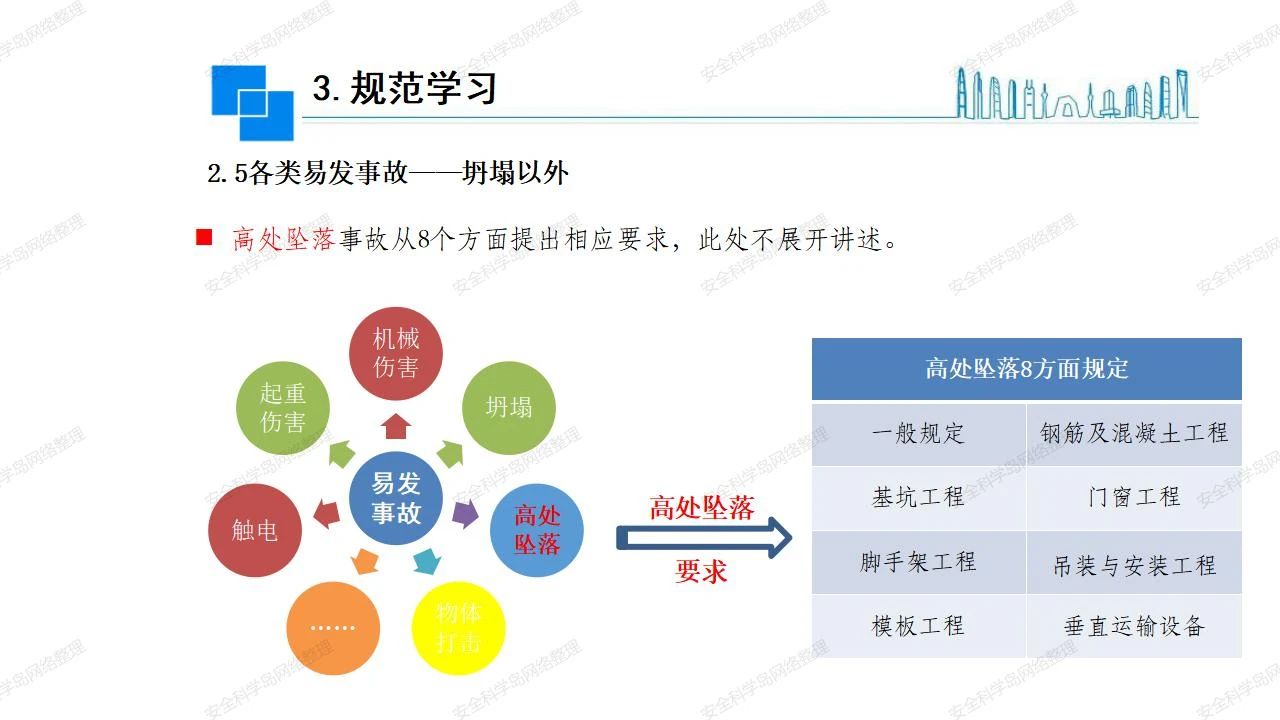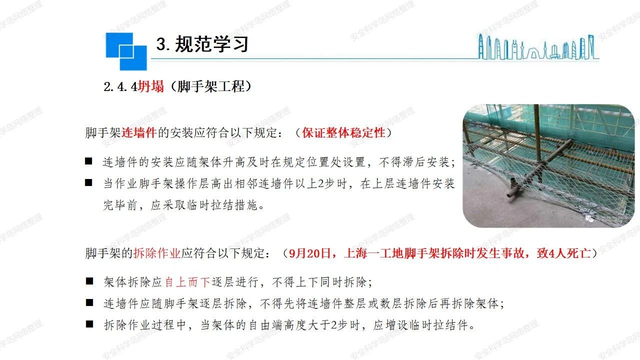 那么,坍塌事故發(fā)生的原因何在? (1)工程結(jié)構(gòu)設(shè)計不合理或計算失誤。 (2)施工前沒有編制切實可行的施工組織設(shè)計和專項施工方案,未做具體技術(shù)安全措施交底,特定施工項目未經(jīng)專家評審論證。 (3)腳手架、模板支撐、起重設(shè)備結(jié)構(gòu)設(shè)計不合理或計算失誤。 (4)建筑物結(jié)構(gòu)質(zhì)量低劣,安全性能差,地基不穩(wěn)定,不均勻沉降。 (5)建筑物結(jié)構(gòu)支撐連接(焊接)不牢固,超載、外力沖擊或嚴重偏心載荷造成失穩(wěn)等。 (6)腳手架及高大模板支架架體結(jié)構(gòu)不符合設(shè)計與規(guī)范要求,整體安全穩(wěn)定性差、超載或嚴重偏心荷載,遇外力沖擊或振動,不按程序拆除架體等因素造成失穩(wěn)等。 (7)基坑、土石方挖土?xí)r土壁不按規(guī)定留設(shè)邊坡(甚至負坡度),缺乏支護或支護不良,土質(zhì)不良或出現(xiàn)地下水、地表水的滲透,土壁經(jīng)不起重載側(cè)壓力或遇外力振動、沖擊等因素造成土壁失穩(wěn)滑坡坍塌。 (8)起重設(shè)備技術(shù)安全性能差,結(jié)構(gòu)強度不夠,安全防護裝置不完善,垂直起重機與建筑物拉結(jié)差,出現(xiàn)超載、碰撞、升降過度或違章操作等原因,造成起重設(shè)備倒塌。 (9)現(xiàn)場作業(yè)環(huán)境不良,安全防護設(shè)施缺乏。 (10)施工現(xiàn)場管理松弛,各項質(zhì)量、安全管理制度流于形式。 (11)片面追求經(jīng)濟利益,偷工減料,施工質(zhì)量差。 (12)施工隊伍素質(zhì)差,不執(zhí)行法規(guī)、標(biāo)準(zhǔn),違章指揮、違章作業(yè),思想上存在盲目性、冒險性、隨意性。 如何預(yù)防坍塌事故? (1)根據(jù)設(shè)計與規(guī)范要求,認真編制施工組織設(shè)計和專項施工技術(shù)方案、應(yīng)急預(yù)案,做好特定施工項目專家評審論證及技術(shù)安全交底工作。 (2)支架、腳手架等搭設(shè)完成后應(yīng)組織相關(guān)部門驗收。支架還應(yīng)按方案要求進行堆載預(yù)壓。 (3)嚴格控制模板支架、腳手架等承受的荷載,模板、腳手架及其支撐體系的施工荷載應(yīng)做到均勻分布,并不得超過設(shè)計要求。嚴禁超載、對構(gòu)筑物進行外力沖擊或偏心載荷。 (4)基坑、土石方挖土?xí)r土壁按規(guī)定留設(shè)邊坡,嚴格按照設(shè)計坡度進行放坡開挖,進行有效支護和排水,并設(shè)置專人對邊坡穩(wěn)定性進行檢測。基坑應(yīng)基坑頂邊緣1m范圍內(nèi)禁止堆放材料。 (5)加強起重設(shè)備的采購管理,嚴禁使用不合格的起重設(shè)備,并定期進行檢測,確保各項性能和安全防護裝置良好;加強起重設(shè)備的安裝、拆除管理;加強起重設(shè)備的使用管理,嚴禁超載、碰撞或違章操作;加強對起重設(shè)備操作人員、指揮人員、安拆人員的安全教育培訓(xùn),考核合格后持證上崗。 (6)加強施工現(xiàn)場管理,設(shè)置有效安全防護設(shè)施。 (7)加強對從業(yè)人員的培訓(xùn)教育,提高隊伍素質(zhì),強化質(zhì)量、安全意識。 (8)強化工程質(zhì)量報驗和檢驗、簽證制度,不經(jīng)檢驗合格,不準(zhǔn)進行下道工序施工。 (9)發(fā)現(xiàn)坍塌事故的險情,要認真分析原因,積極研究提出排除隱患的整改措施,并監(jiān)督執(zhí)行。