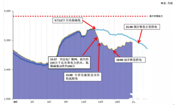 5月13日14時(shí)37分,興達(dá)電廠因接入345千伏路北變電站母線故障,導(dǎo)致電廠電力送出受阻,兩臺燃煤及兩臺燃?xì)鈾C(jī)組脫網(wǎng),系統(tǒng)損失有效電力供應(yīng)約220萬千瓦,造成臺灣系統(tǒng)頻率驟降,為維持電網(wǎng)穩(wěn)定,電力系統(tǒng)在第一時(shí)間自動啟動低頻卸載約300萬千瓦。臺電評估短時(shí)間內(nèi)無法立即復(fù)電,為維系電力系統(tǒng)安全,自下午3時(shí)起執(zhí)行緊急分區(qū)輪流停電,最大限電達(dá)到350萬千瓦。事故過程系統(tǒng)負(fù)荷變化曲線下圖所示。