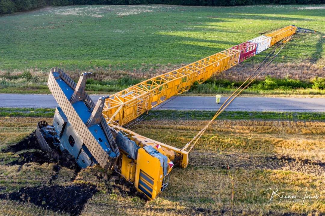 該風電場項目準備安裝 61 臺渦輪機,最大發(fā)電量為 219.6 兆瓦。該項目將覆蓋約 50,000 英畝土地。事故吊車屬于當?shù)匾患绎L能和太陽能公司,當時這輛800t履帶吊車正用于安裝風電機組,該風電機組通常位于雅芳北部和特里普西南部。當時疑似下方地面松軟,未進行吊裝前的勘察工作,負載過高造成大規(guī)模下陷,從而導致整車側翻。