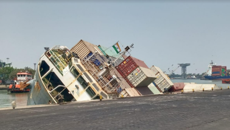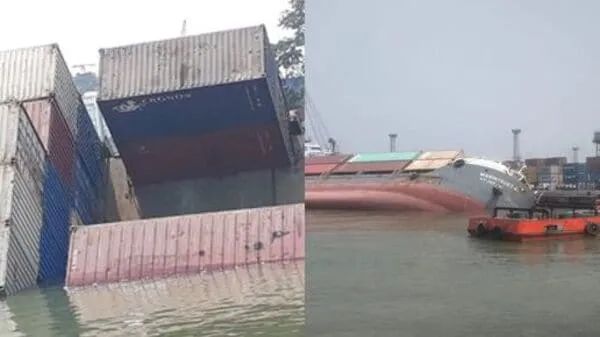 加爾各答港口官員報(bào)告說(shuō),這艘船于3月22日從印度薩加爾港抵達(dá)加爾各答,在3月24日上午剛剛完成裝載,總共裝載了165 個(gè)集裝箱,包括120個(gè) 20 英尺集裝箱和45 個(gè) 40英尺集裝箱。該船原定于今天啟程前往孟加拉國(guó)吉大港,然而突然在沒有任何征兆的情況下發(fā)生傾斜,并在15分鐘內(nèi)側(cè)翻和部分沉沒,導(dǎo)致集裝箱掉入港口。