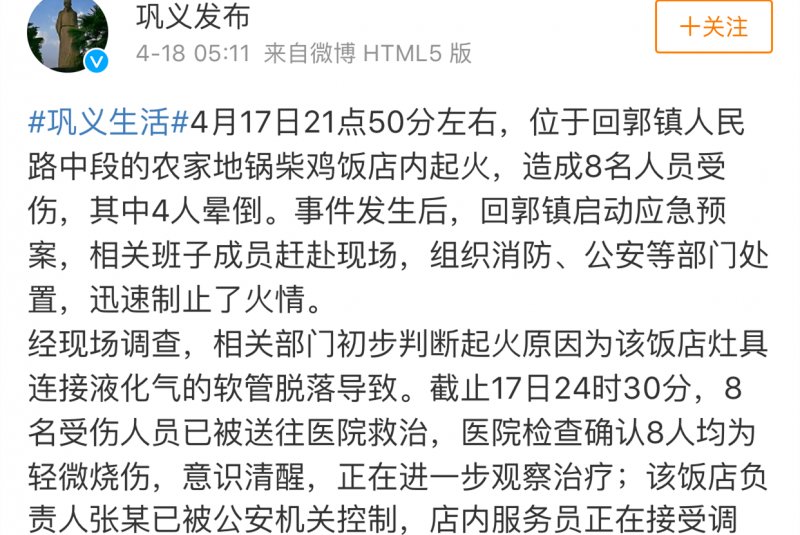“鞏義發(fā)布”稱:4月17日21時50分左右,位于回郭鎮(zhèn)人民路中段的農(nóng)家地鍋柴雞飯店內(nèi)起火,造成8名人員受傷,其中4人暈倒。事件發(fā)生后,回郭鎮(zhèn)啟動應(yīng)急預(yù)案,相關(guān)班子成員趕赴現(xiàn)場,組織消防、公安、等部門處置,迅速制止了火情。