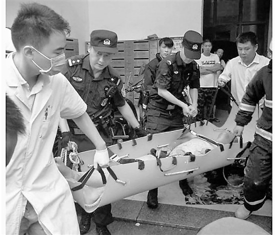 情況危急,消防隊(duì)員與PTU隊(duì)員合力將受傷男子抬上擔(dān)架,由120急救車(chē)送往醫(yī)院救治。