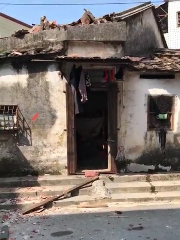 現(xiàn)場(chǎng)可以看到,該棟民宅的屋頂有四分之一的瓦片被毀,從隔壁的樓上往下看時(shí),可以看見(jiàn)屋頂已經(jīng)出現(xiàn)一個(gè)大洞。